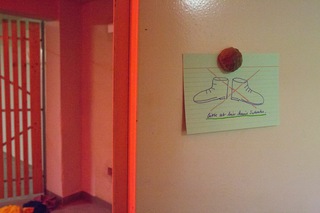 painted walls, light, drawing on paper, stone, sound loop, special shoes, found objects, camping mats, different food from childhood